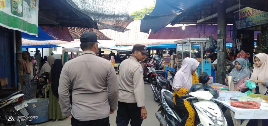 LHOKSEUMAWE – Dua Personel Polsek Syamtalira Bayu melaksanakan patroli di pusat penjualan takjil di kawasan Keude Bayu, Aceh Utara, wilayah hukum Polres Lhokseumawe, Kamis (20/4/2023) sore.