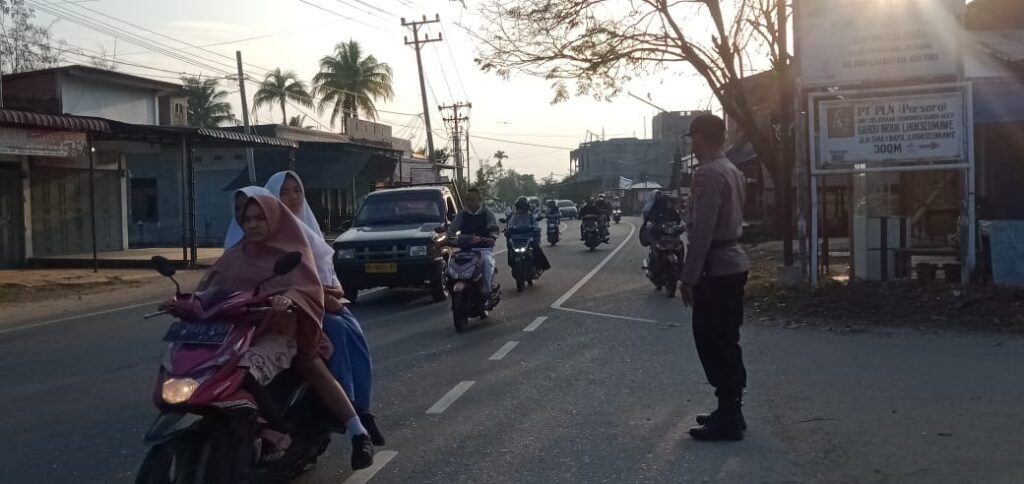 LHOKSEUMAWE – Personel Polsek Syamtalira Bayu melaksanakan strong poin atau pengaturan lalu lintas di Simpang Cot Plieng, Syamtalira Bayu, Aceh Utara, wilayah hukum Polres Lhokseumawe, Kamis (25/5/2023) pagi.
