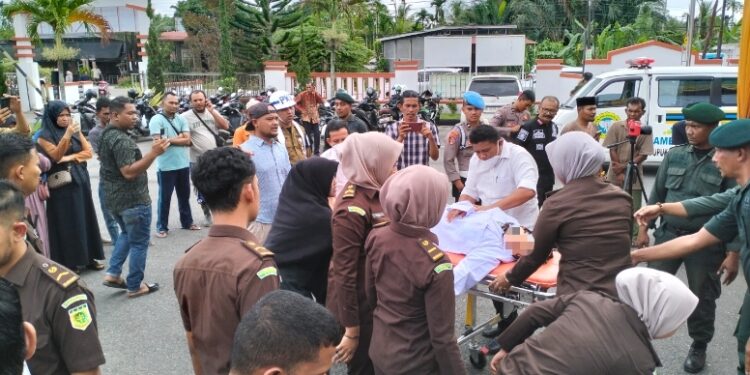 LHOKSUKON – Dua dari 12 terpidana hukuman cambuk jatuh pingsan saat menjalani hukuman di lokasi eksekusi, halaman Kejaksaan Negeri (Kejari) Aceh Utara, Rabu (27/12/2023).