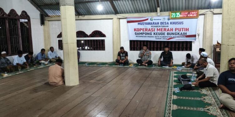 Muara Batu – Kapolsek Muara bati hadiri rapat pembentukan Koperasi Merah Putih Gampong Bungkaih, Kecamatan Muara Batu, Kabupaten Aceh Utara,. Minggu (25/5/2025) malam