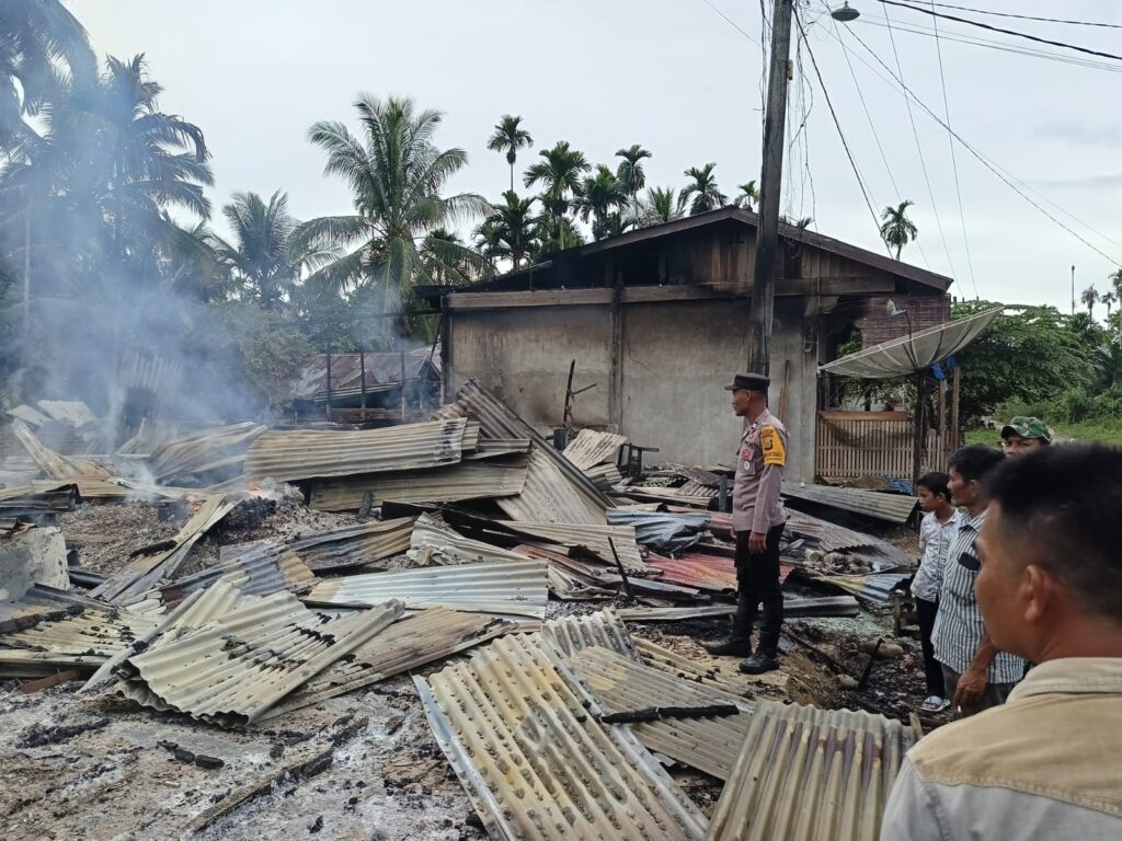 LHOKSEUMAWE – Empat unit ruko berkonstruksi semi permanen di Desa Gunci, Kecamatan Sawang, Aceh Utara, wilayah hukum Polres Lhokseumawe terbakar, Selasa (28/11/2023) sekira pukul 03.30 WIB, personel Polsek Sawang amankan TKP.