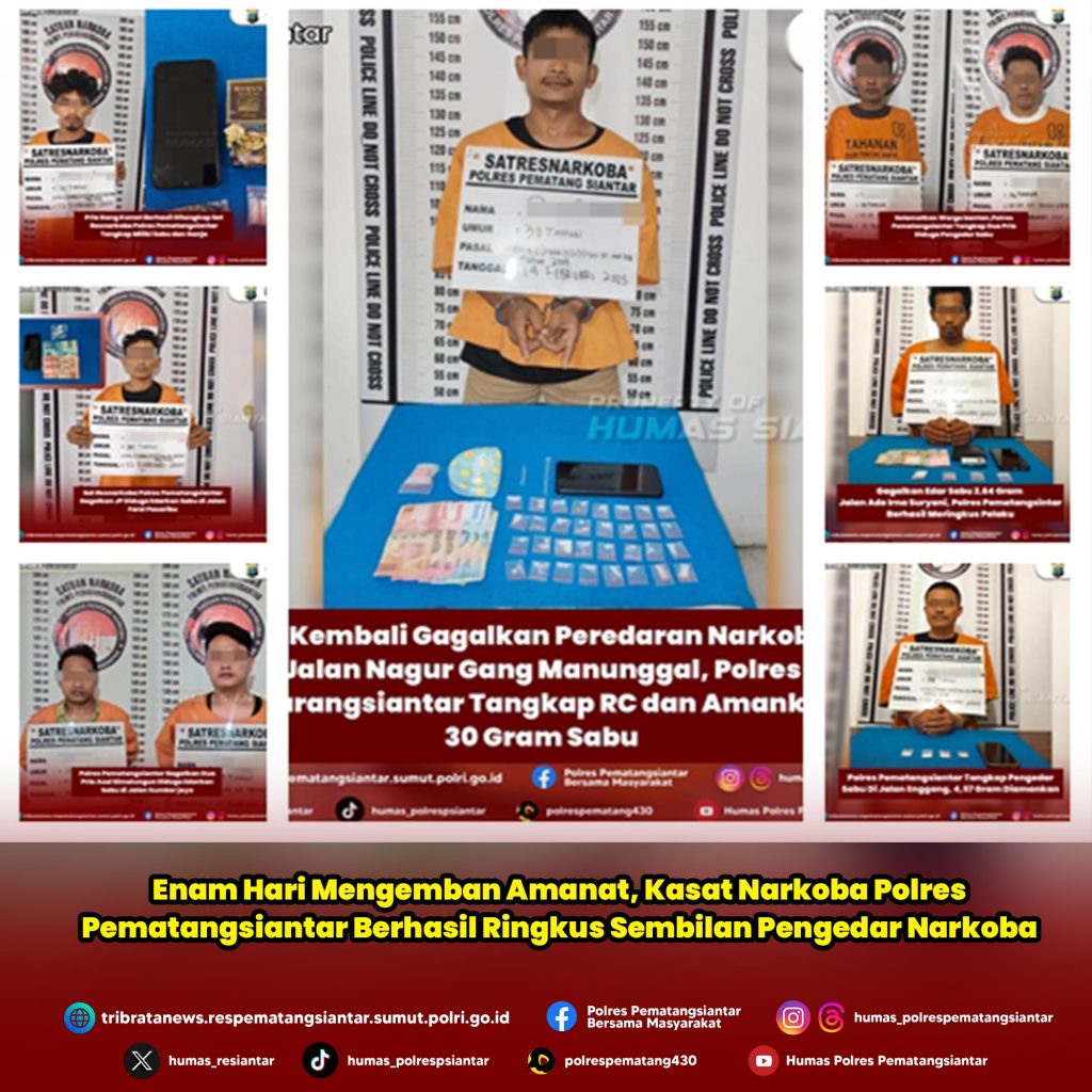 Ps. Kasi humas Polres Pematangsiantar Iptu Agustina Tritadewi Mengatakan Dimana Kasat Narkoba berhasil meringkus sebanyak sembilan orang pengedar sabu dari beberapa tempat Secara berturut. Barang bukti narkotika yang disita jenis sabu berat bruto 20,9 gram dan ganja berat bruto 2,56 gram
