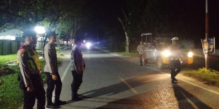 LHOKSEUMAWE – Personel Polres Lhokseumawe melakukan pengamanan kampanye tatap muka calon legislatif (caleg) DPRK Lhokseumawe dari Partai Nasional Demokrat (Nasdem) di Kecamatan Muara Satu, Kota Lhokseumawe, Rabu (3/1/2024) malam.