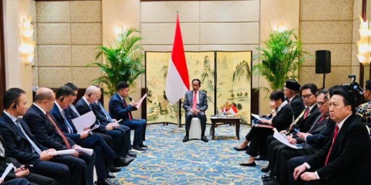 TIONGKOK – Presiden Joko Widodo menggelar pertemuan bisnis bersama Kamar Dagang Indonesia di Tiongkok (INACHAM) dan sejumlah pengusaha Tiongkok di Shangri-La Hotel, Chengdu, Republik Rakyat Tiongkok (RRT), pada Jumat, 28 Juli 2023. Dalam pertemuan tersebut, Presiden Jokowi menekankan komitmen Indonesia untuk menjaga investasi tetap stabil dan berjalan baik.