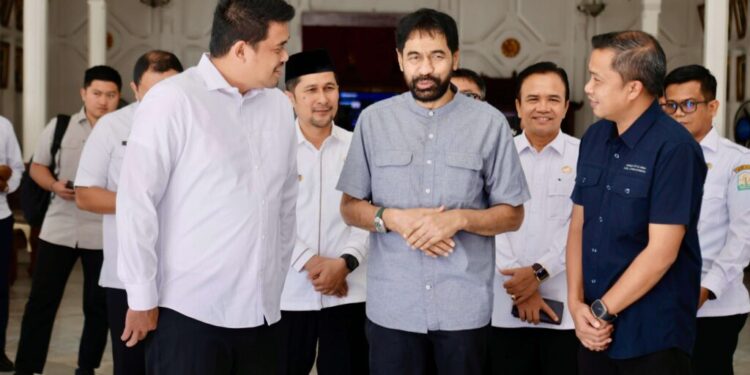 Banda Aceh : Gubernur Aceh, Muzakir Manaf atau Mualem menerima kunjungan silaturahmi Gubernur Sumatera Utara Bobby Nasution dan Bupati Tapanuli Tengah Masinton Pasaribu, di Pendopo Gubernur Aceh, Rabu (4/6/2025). Boby tiba di Pendopo Gubernur Aceh pada pukul 09.30 WIB.