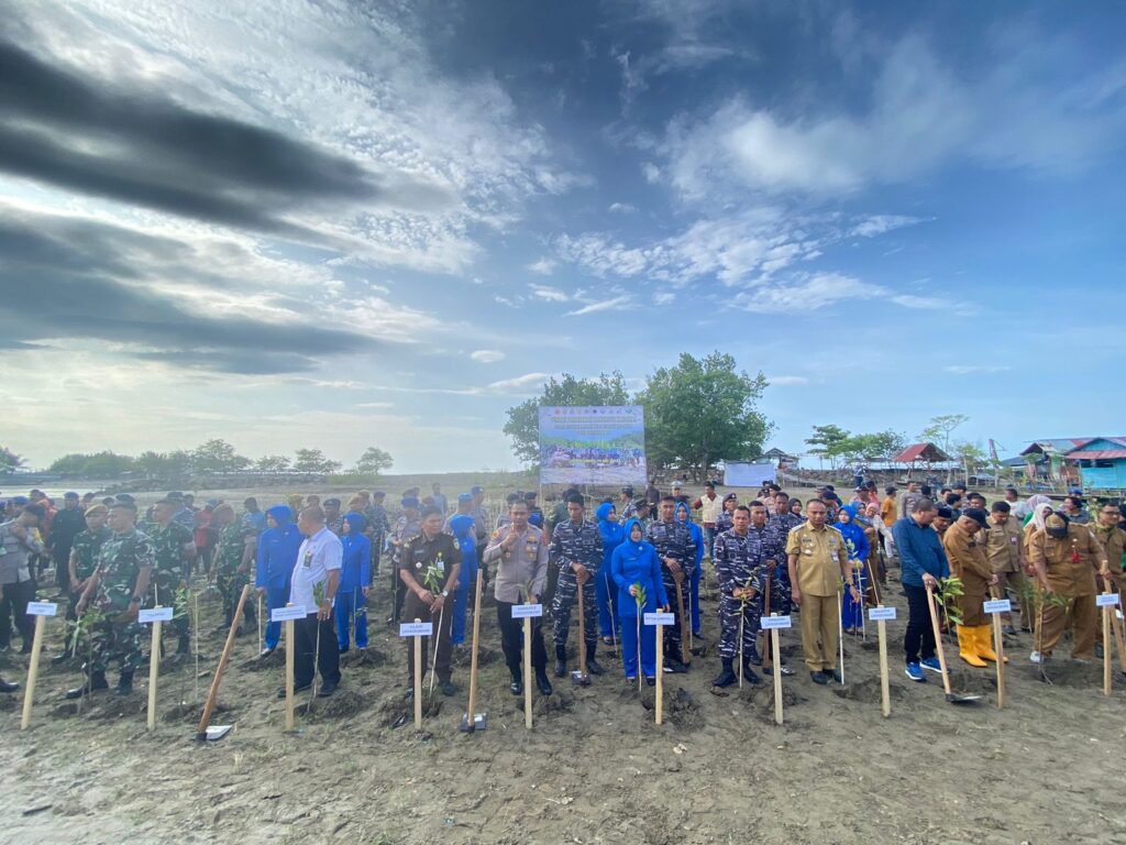 LHOKSEUMAWE – Kapolres Lhokseumawe, AKBP Henki Ismanto, SIK menghadiri puncak penanaman 2000 pohon mangrove Nasional seluas 2 Hektar yang berlangsung secara serentak jajaran TNI di seluruh Indonesia di kawasan wisata pantai Rancong, Muara Satu, Kota Lhokseumawe, Senin (15/5/2023).