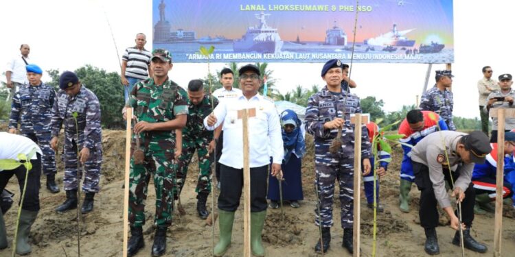 ACEH UTARA — Penjabat Bupati Aceh Utara Dr Mahyuzar, MSi, bersama Komandan Pangkalan TNI Angkatan Laut (Lanal) Lhokseumawe dan sejumlah pejabat lainnya menanami ribuan pohon di tepian pantai Gampong Matang Puntong Kecamatan Seunuddon Kabupaten Aceh Utara, Rabu, 6 Desember 2023.