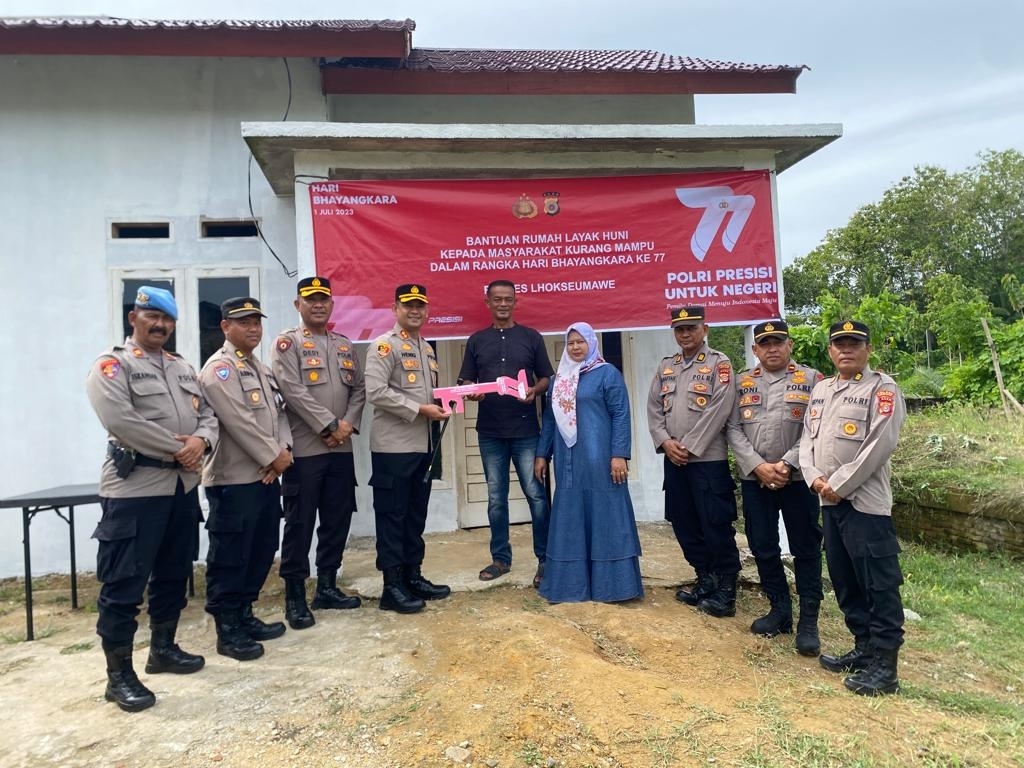 LHOKSEUMAWE – Dalam rangka Hari Bhayangkara ke 77, Kapolres Lhokseumawe, AKBP Henki Ismanto, SIK menyerahkan rumah layak huni kepada warga Meunasah Alue, Kecamatan Muara Dua, Kota Lhokseumawe, Jumat (30/6/2023).