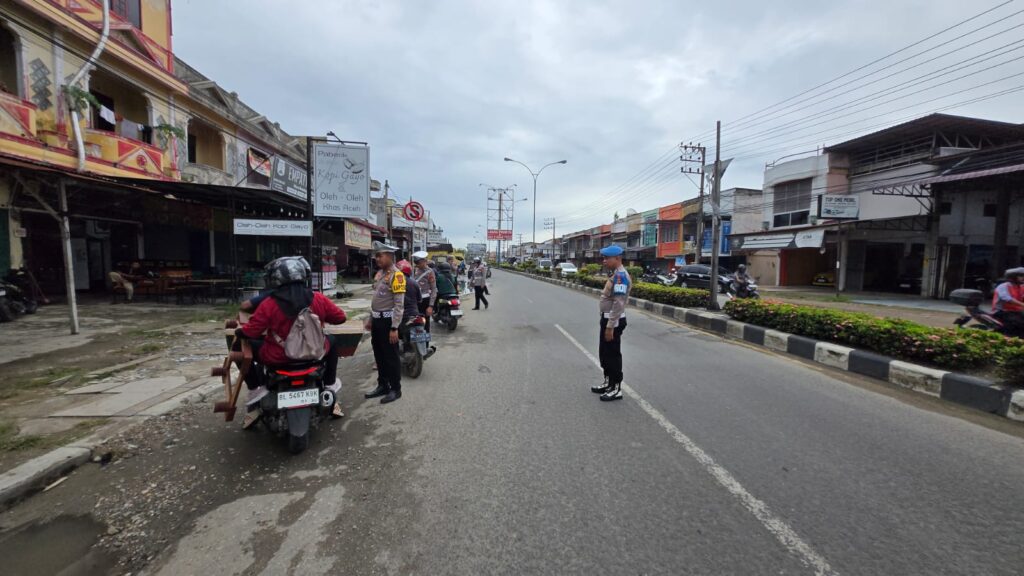 Lhokseumawe - Personel Polsek Banda Sakti, Polres Lhokseumawe melaksanakan kegiatan pengamanan dan pengaturan arus lalu…