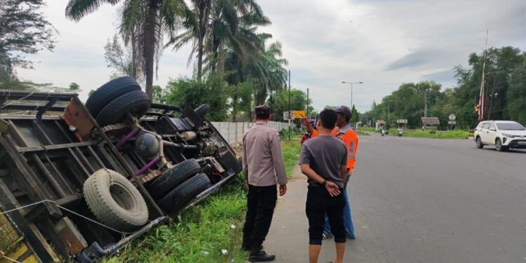 Lhokseumawe – Satu unit mobil truk Colt Diesel bermuatan barang kelontong mengalami kecelakaan tunggal dan terbalik ke dalam parit di kawasan Simpang Pelabuhan, Desa Blang Naleung Mameh, Kecamatan Muara Satu, Kota Lhokseumawe, Selasa (14/4/2026) pagi.