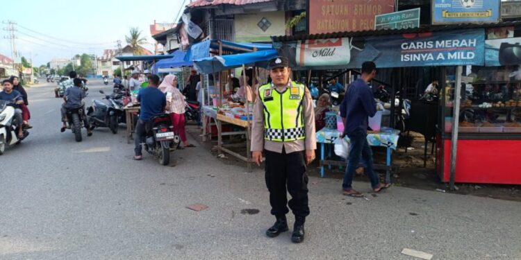 Lhokseumawe – Suasana jelang berbuka puasa di Kecamatan Muara Dua, Kota Lhokseumawe, Minggu (1/3/2026), tampak lebih tertib dan nyaman. Di tengah ramainya warga berburu takjil, dua personel Polsek Muara Dua sigap berdiri di Simpang Kandang Desa Meunasah Mee dan Simpang Elak Desa Alue Awee untuk mengatur arus lalu lintas.