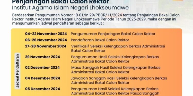 Lhokseumawe – Institut Agama Islam Negeri (IAIN) Lhokseumawe resmi membuka penjaringan bakal calon rektor untuk periode kepemimpinan 2025-2029. Hal ini diumumkan dalam surat pengumuman nomor B-01/In.29/PBCR/11/2024 yang terbit tanggal 4 November 2024.