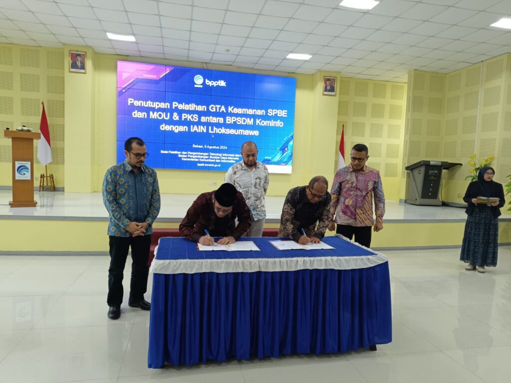 Kesepakatan pengembangan tersebut ditandai dengan penandatangan Nota Kesepahaman antara Badan Pengembangan Sumber Daya Manusia Komunikasi dan Informatika dengan IAIN Lhokseumawe tentang sinergi Penyelenggaraan Program Pendidikan dan Pengabdian kepada masyarakat di bidang Komunikasi dan Informatika yang ditandatangani Rektor IAIN Lhokseumawe Prof Dr Danial, M.Ag dan Dr Eng Hary Budiarto, M.Kom IPM, selaku Kepala Badan Pengembangan SDM Kominfo.