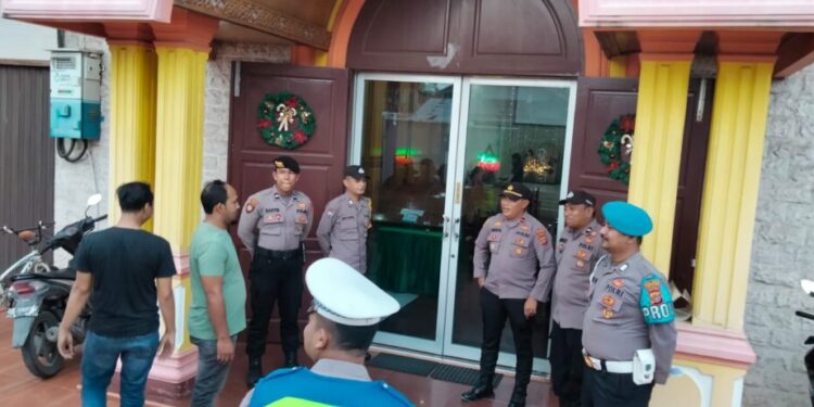 LHOKSEUMAWE – Personel Polres Lhokseumawe melakukan pengamanan di dua gereja wilayah Kota Lhokseumawe yang sedang melaksanakan acara dalam rangka menyambut Natal, Sabtu (16/12/2023).
