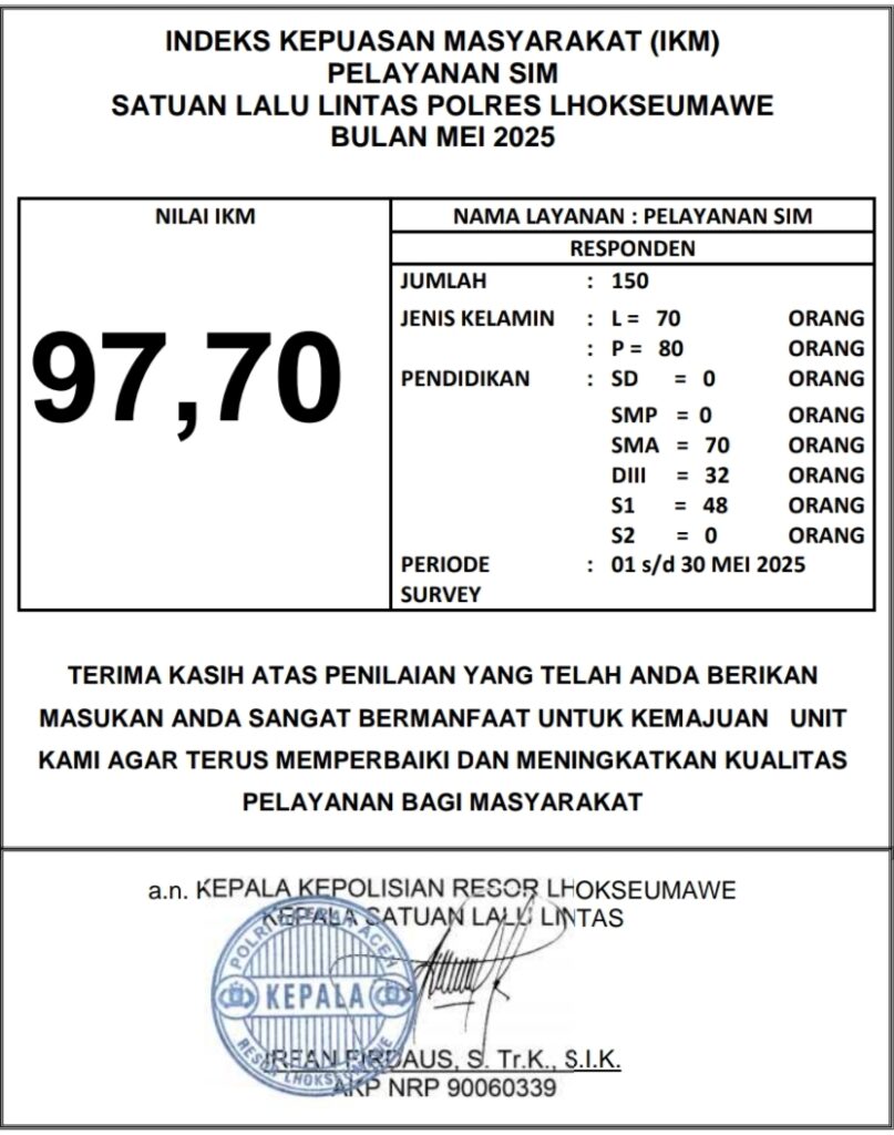 IKM Pelayanan SIM Polres Lhokseumawe Periode Mei 2025 Tembus 97,70
