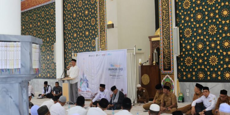 ACEH UTARA – Wakil Bupati Aceh Utara, Tarmizi, S.I.Kom., atau yang lebih dikenal Panyang, membuka kegiatan Manasik Haji Kabupaten Aceh Utara 1446H, tahun 2025 di Masjid Haji Muhammad Hanafiah, Gampong Ranto, Lhoksukon, Selasa (22/4/2025). Sebanyak 399 jamaah calon haji dari kabupaten itu telah melunasi biaya haji dan siap diberangkatkan ke Tanah Suci tahun ini.