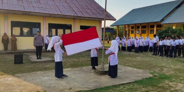 LHOKSEUMAWE – Kanit Binmas Polsek Meurah Mulia, Aipda Dedi P Saragih menjadi pembina upacara di SMPN 1 Meurah Mulia, dalam kegiatan ini personel meminta para siswa tidak terlibat aksi kenakalan remaja, Senin (13/3/2023) pagi.