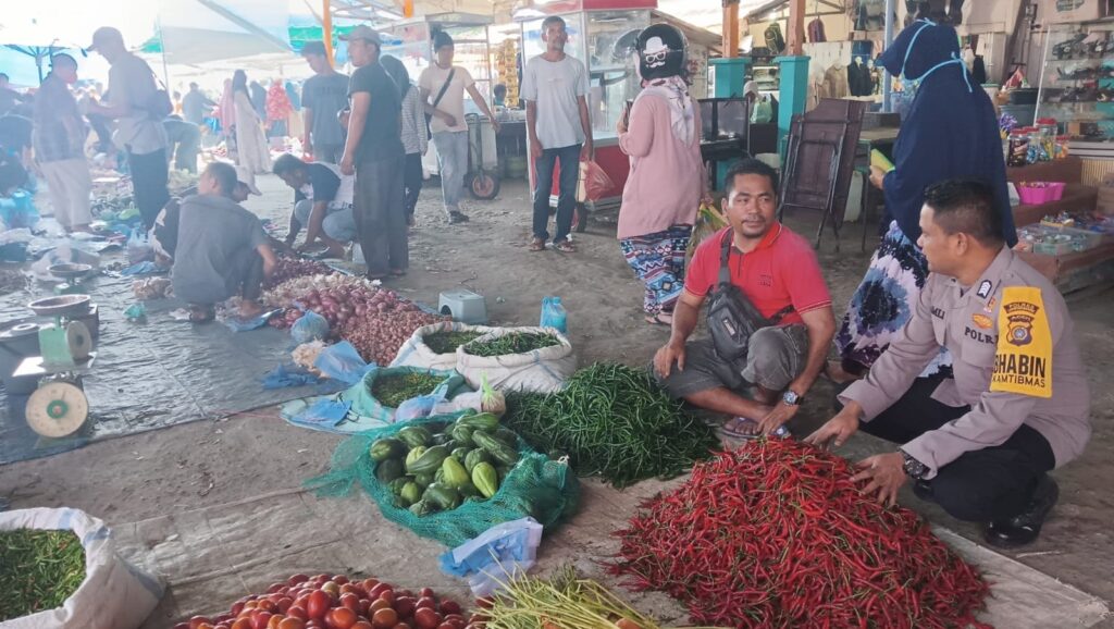 LHOKSEUMAWE – Personel Polsek Muara Satu turun ke sejumlah pedagang di pasar Batuphat, Kecamatan Muara Satu, Kota Lhokseumawe, kegiatan tersebut guna menjaga ketersediaan sembako tetap stabil, Rabu (24/5/2023).