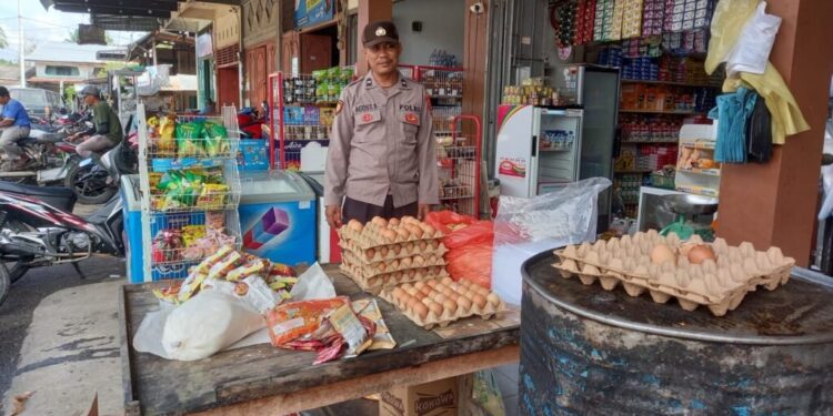 LHOKSEUMAWE – Guna menjaga stablitas stok sembilan bahan pokok (sembako), personel Polsek Meurah Mulia Kembali turun ke pasar Keude Karieng, Kecamatan Meurah Mulia, Aceh Utara, wilayah hukum Polres Lhokseumawe, Kamis (20/7/2023).