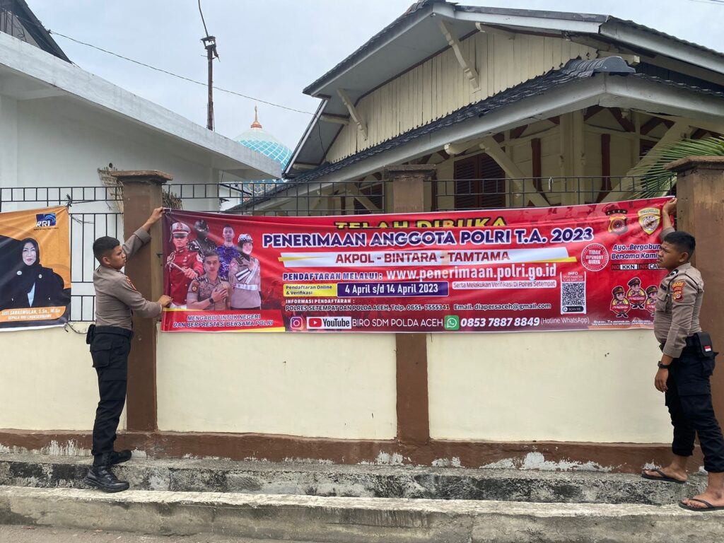 LHOKSEUMAWE – Jajaran Polres Lhokseumawe melakukan sosialisasi pendaftaran penerimaan anggota Polri tahun 2023 dengan memasang spanduk di wilayah hukum Polres Lhokseumawe.
