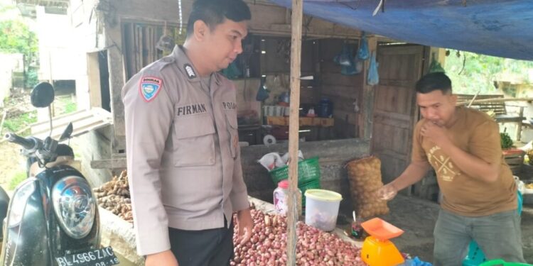 LHOKSEUMAWE – Personel Polsek Nisam rutin blusukan ke pasar Keude Amplah, Kecamatan Nisam, Aceh Utara, wilayah hukum Polres Lhokseumawe, kegiatan tersebut guna menjamin ketersediaan sembako di pasaran, Minggu (4/6/2023).