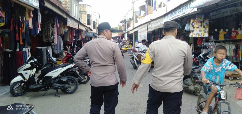 LHOKSEUMAWE – Personel Polsek Syamtalira Bayu mengatur lalu lintas di pusat keramaian jelang waktu berbuka puasa di Keude Bayu, Syamtalira Bayu, Aceh Utara, wilayah hukum Polres Lhokseumawe, Minggu (2/4/2023) sore.