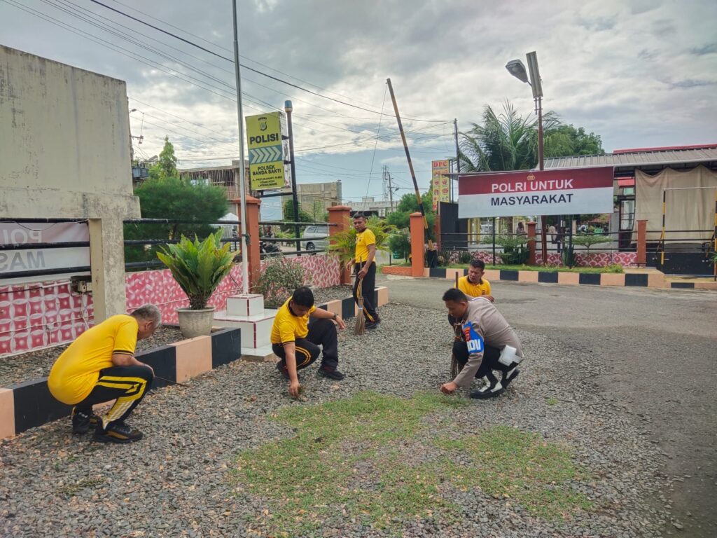 Lhokseumawe – Dalam rangka menyambut Hari Ulang Tahun (HUT) Bhayangkara ke-79 yang diperingati setiap tanggal 1 Juli, Polsek Banda Sakti, Polres Lhokseumawe, melaksanakan kegiatan korve atau kerja bakti di lingkungan mako, Rabu (18/6/2025) pagi.