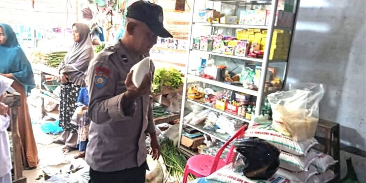 LHOKSEUMAWE – Personel Polsek Simpang Keuramat memantau persediaan sembako ke sejumlah pedagang di pasar Keude Simpang Empat, Simpang Keuramat, Aceh Utara, wilayah hukum Polres Lhokseumawe, Jumat (16/6/2023).