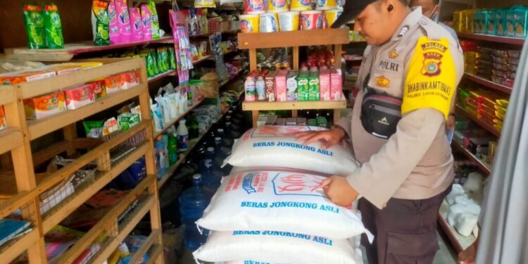 LHOKSEUMAWE – Guna mencegah kelangkaan barang sembako menjelang lebaran Idul Fitri 1444 H, personel Polsek Kuta Makmur mengecek stabilitas stok sembako di pasar Keude Blang Ara, Kuta Makmur, Aceh Utara, wilayah hukum Polres Lhokseumawe, Minggu (16/4/2023).
