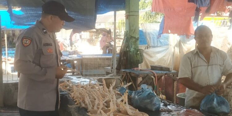 LHOKSEUMAWE – Personel Polsek Nisam mengecek persediaan daging ayam di pasar Gampong Meucat, Kecamatan Nisam, Aceh Utara, wilayah hukum Polres Lhokseumawe, Sabtu (17/6/2023).