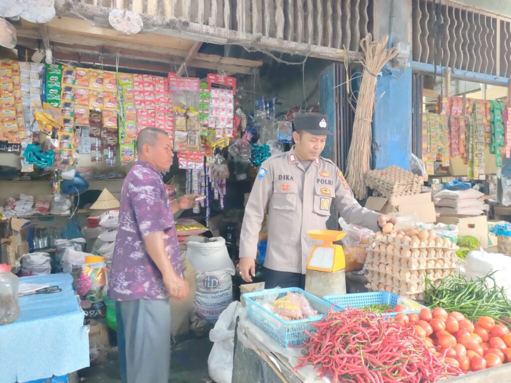 Petugas patroli tampak secara intensif memantau situasi pasar guna memastikan kelancaran bertransaksi bagi para pedagang dan pengunjung.