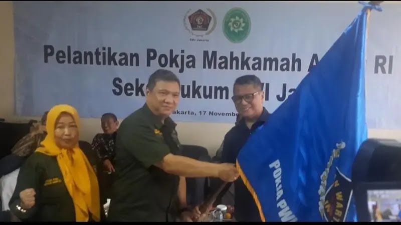 Dalam prosesi pelantikan dan pengukuhan, Ketua Seksi Hukum PWI Jaya Umi Sjarifah menyerahkan pataka PWI kepada Plt Ketua PWI Jaya Kesit Budi Handoyo dan selanjutkan diserahkan kepada Ketua Pokja MA terpilih Jimmy Endey.