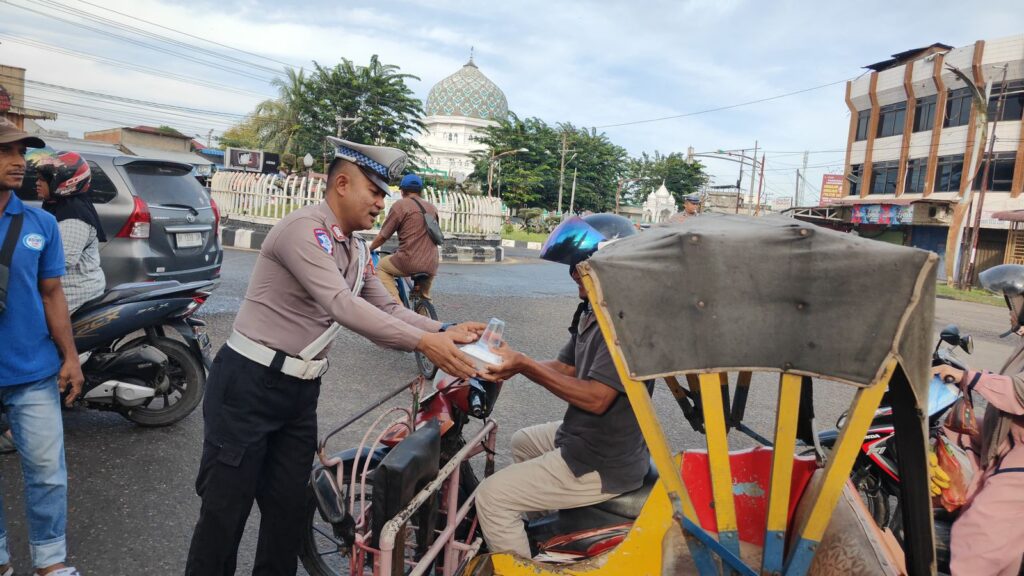 Salah satu penerima, Husni (45), seorang pengemudi becak motor, mengungkapkan rasa syukurnya. “Alhamdulillah, bantuan ini sangat berarti. Apalagi hari ini saya belum sempat sarapan. Terima kasih banyak untuk kepolisian yang peduli dengan kami,” katanya dengan senyum lebar.