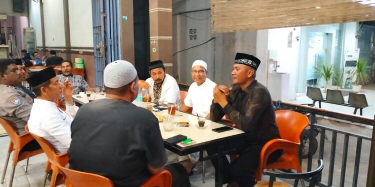 LHOKSEUMAWE – Jumat Tarawih Curhat bersama Kapolsek Muara Satu, Iptu Syahrizal, tokoh agama mengeluhkan masih ada warga yang nongkrong di warkop pada saat pelaksanaan ibadah shalat Isya dan tarawih, Jumat (31/3/2023).