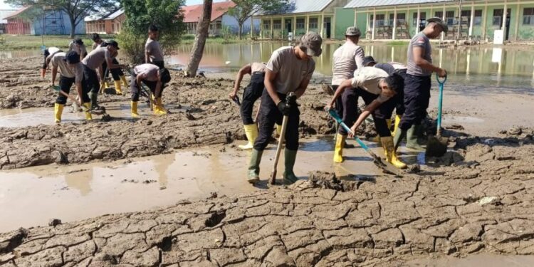 Kegiatan yang dimulai sekitar pukul 10.00 WIB tersebut difokuskan pada pengangkatan lumpur sisa banjir yang menggenangi halaman serta ruang-ruang kelas sekolah. Pembersihan ini merupakan bagian dari upaya percepatan pemulihan sarana pendidikan agar proses belajar mengajar dapat segera kembali berjalan normal.