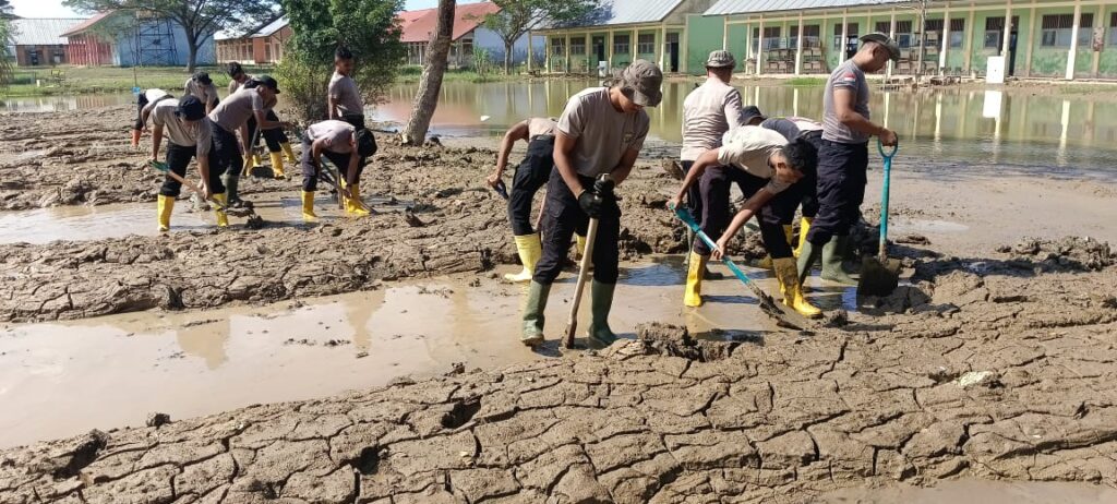 Kegiatan yang dimulai sekitar pukul 10.00 WIB tersebut difokuskan pada pengangkatan lumpur sisa banjir yang menggenangi halaman serta ruang-ruang kelas sekolah. Pembersihan ini merupakan bagian dari upaya percepatan pemulihan sarana pendidikan agar proses belajar mengajar dapat segera kembali berjalan normal.