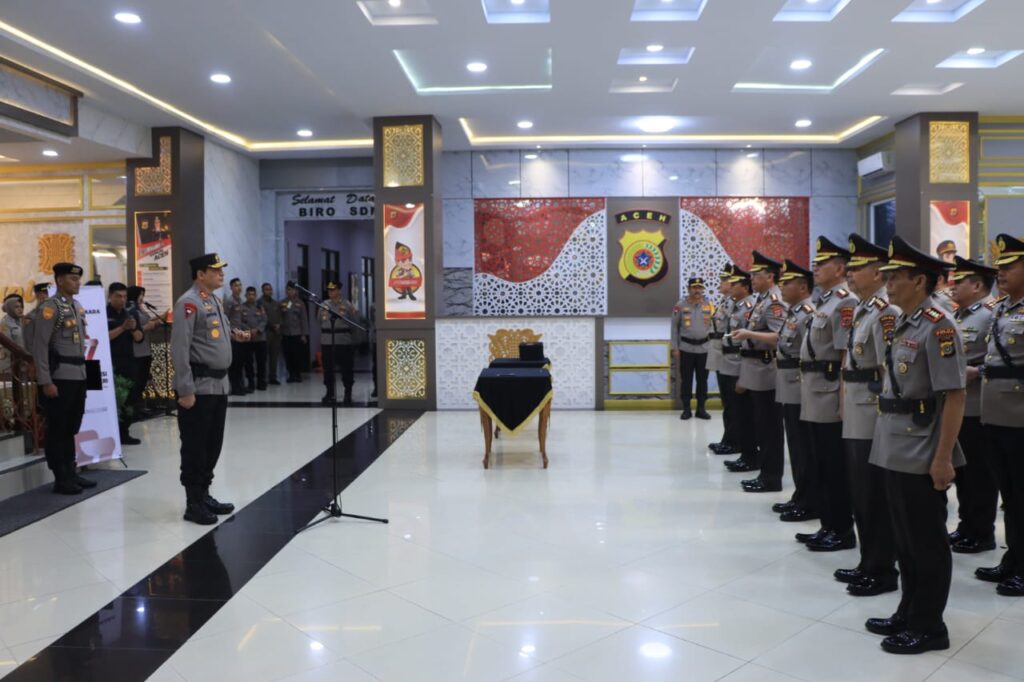 BANDA ACEH – Kapolda Aceh, Irjen Pol Drs Ahmad Haydar, SH, MM melantik sejumlah Pejabat Utama (PJU) dan enam kapolres jajaran Polda Aceh, kegiatan tersebut berlangsung di Loby Mapolda Aceh, Rabu (12/7/2023).
