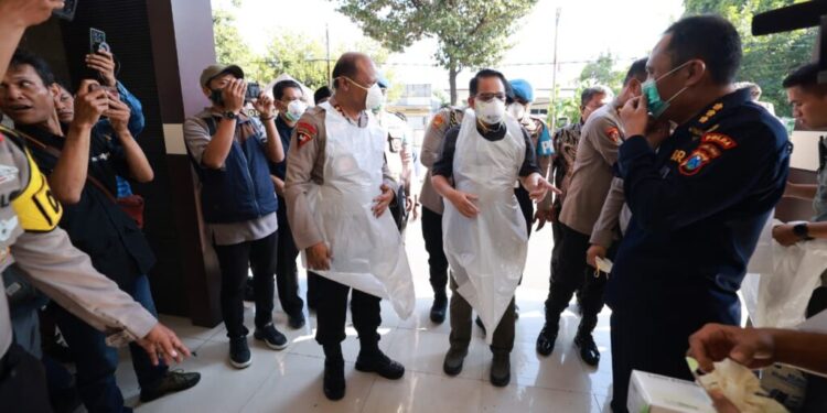Surabaya – Kapolda Jawa Timur, Irjen Pol Drs. Nanang Avianto,M.Si bersama Pejabat Utama (PJU) Polda Jatim meninjau proses identifikasi korban robohnya bangunan di Pondok Pesantren (Ponpes) Al Khoziny, Buduran, Sidoarjo,Jumat (3/10/2025).