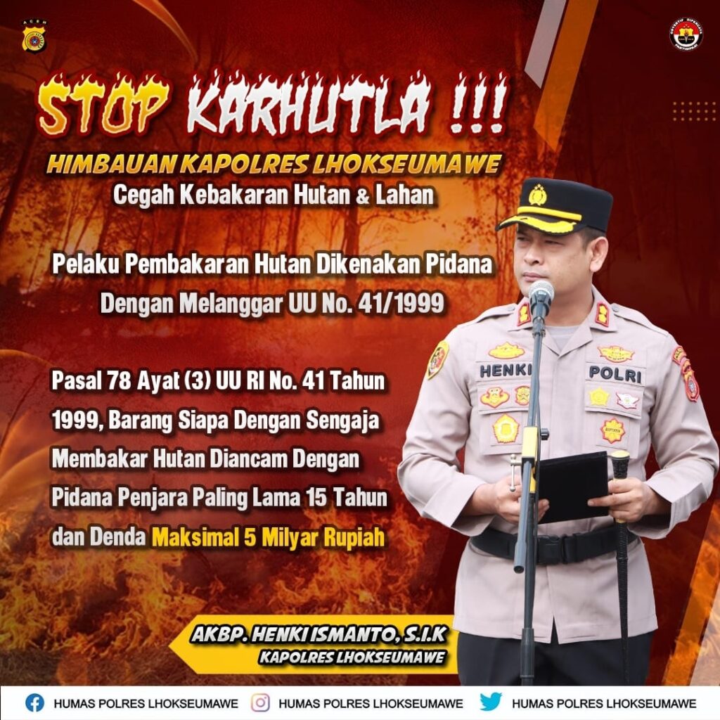 LHOKSEUMAWE – Kapolres Lhokseumawe, AKBP Henki Ismanto, SIK mengajak semua lapisan masyarakat bersinergi dengan pihak Kepolisian untuk mencegah kebakaran hutan dan lahan (Karhutla), Kamis (27/7/2023).