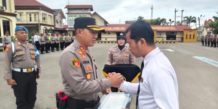 LHOKSEUMAWE – Dedikasi dan pengorbanan anggota Polri dalam misi kemanusiaan kembali mendapat apresiasi. Kapolres Lhokseumawe AKBP Dr. Ahzan, S.H., S.I.K., M.S.M., M.H memimpin langsung upacara pemberian penghargaan kepada Aipda Maulizar, Kanit Intel Polsek Sawang, yang berlangsung di halaman Satya Haprabu Polres Lhokseumawe, Senin (12/1/2026) pagi.