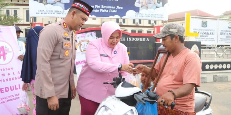 LHOKSEUMAWE – Kapolres Lhokseumawe, AKBP Henki Ismanto S.I.K, turut didampingi oleh Ketua Bhayangkari Cabang Lhokseumawe, Ny. Resti Henki, dalam aksi mulia pembagian 300 paket takjil gratis di depan Mapolres Lhokseumawe, Kamis (21/3/2024) sore