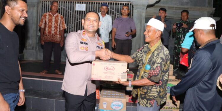 LHOKSEUMAWE – Kapolres Lhokseumawe AKBP Henki Ismanto bersama unsur Muspida mengunjungi dan menyerahkan bantuan masa panik kepada warga terdampak banjir di wilayah Kecamatan Muara Satu, Kota Lhokseumawe, Senin (25/12/2023) malam.