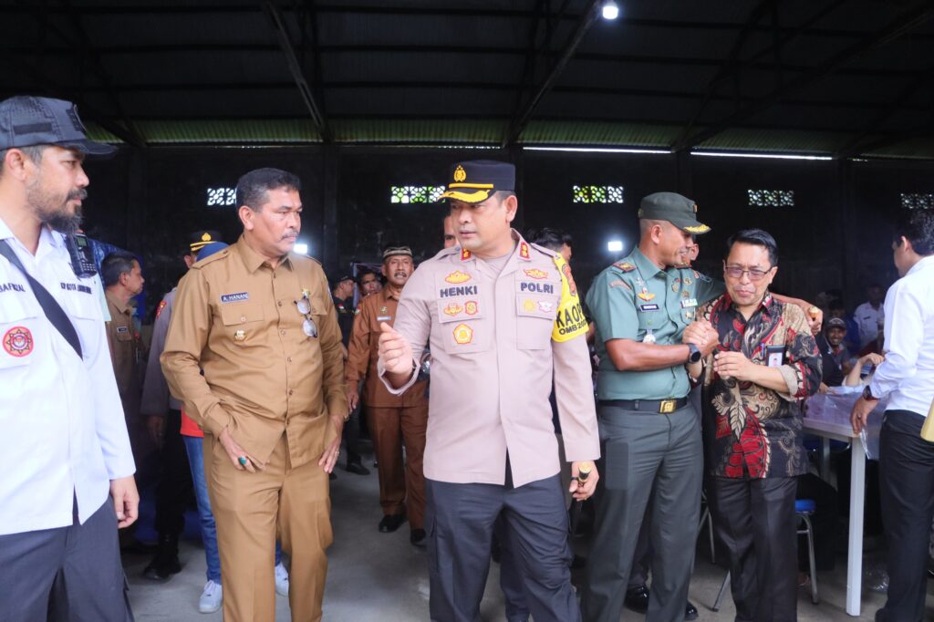 LHOKSEUMAWE – Kapolres Lhokseumawe, AKBP Henki Ismanto bersama unsur Muspida meninjau proses penyortiran dan pelipatan surat suara Pemilu 2024 di gudang logistik KIP Lhokseumawe, Senin (8/1/2024).