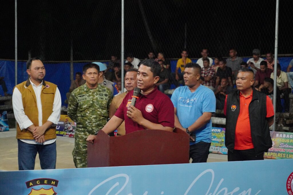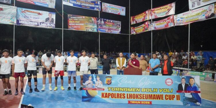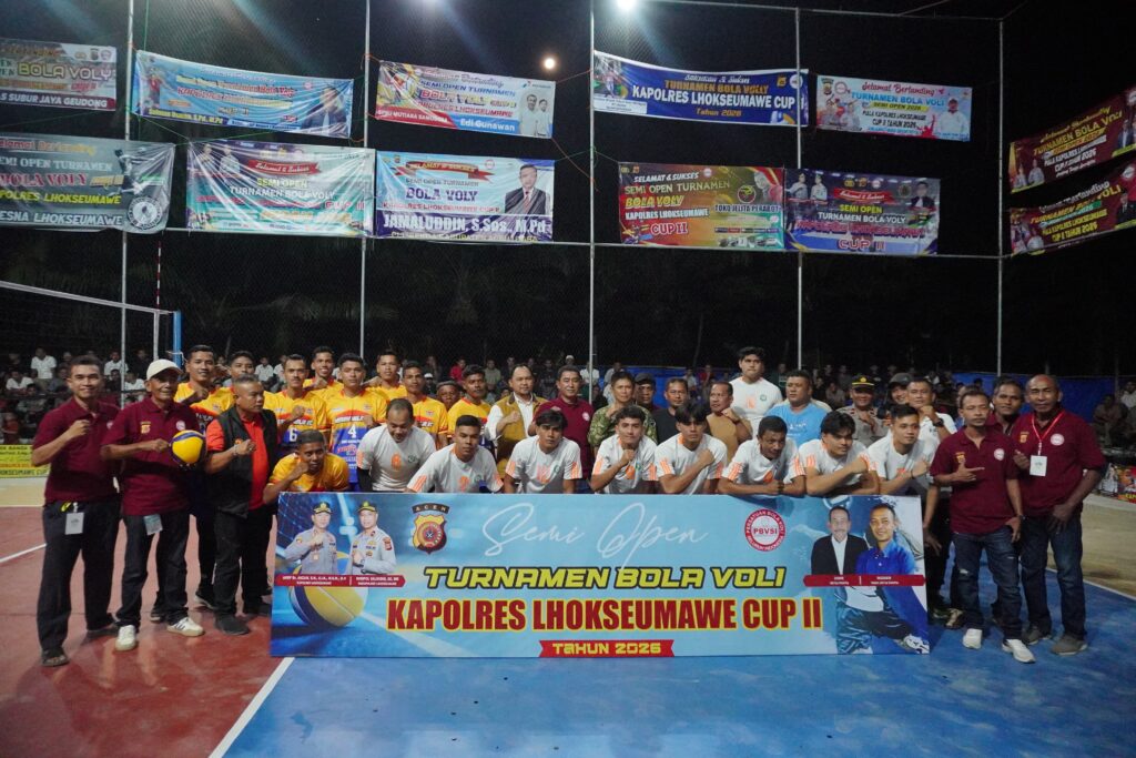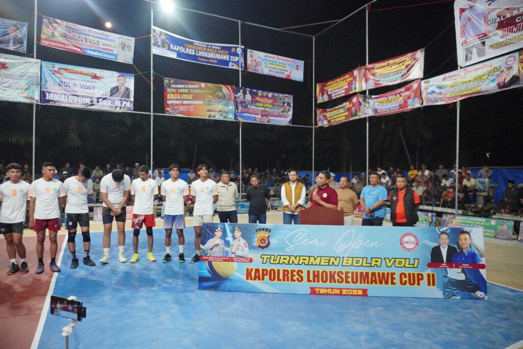 ACEH UTARA – Kapolres Lhokseumawe, AKBP Dr. Ahzan, S.H., S.I.K., M.S.M., M.H., secara resmi membuka Turnamen Bola Voli Semi Open Kapolres Lhokseumawe Cup II di Lapangan Muria Kareng, Desa Meunasah Tanjung, Kecamatan Meurah Mulia, Kabupaten Aceh Utara, Jumat malam (3/4/2026).