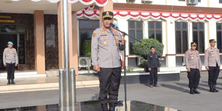 Lhokseumawe – Kapolres Lhokseumawe, AKBP Dr. Ahzan, S.H., S.I.K., M.S.M., M.H memimpin apel pagi di halaman Mapolres Lhokseumawe, Senin (26/8/2025). Dalam arahannya, Kapolres menyampaikan program Kapolda Aceh yang baru Brigjen Pol Drs. Marzuki Ali Basyah, M.M dengan tagline “Polda Meutuah, Menuju Aceh Meusyeuhu” sebagai landasan kerja seluruh personel kepolisian di wilayah hukum Polres Lhokseumawe.
