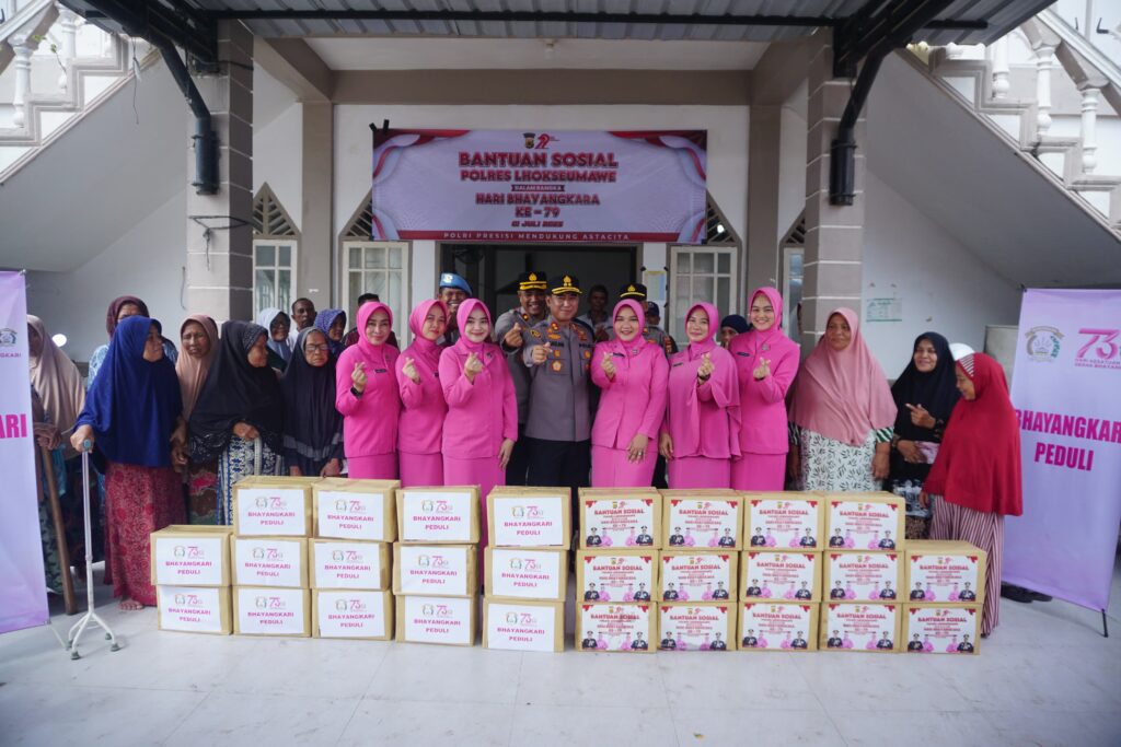 Lhokseumawe – Menyambut Hari Bhayangkara ke-79, Kapolres Lhokseumawe AKBP Dr. Ahzan, SH, SIK, MSM, MH bersama jajaran dan pengurus Bhayangkari Cabang Lhokseumawe melaksanakan kegiatan silaturrahmi serta pembagian bantuan sosial (bansos) kepada masyarakat di Meunasah Gampong Pusong Lama, Kecamatan Banda Sakti, Kota Lhokseumawe, Selasa (17/6/2025) pagi.