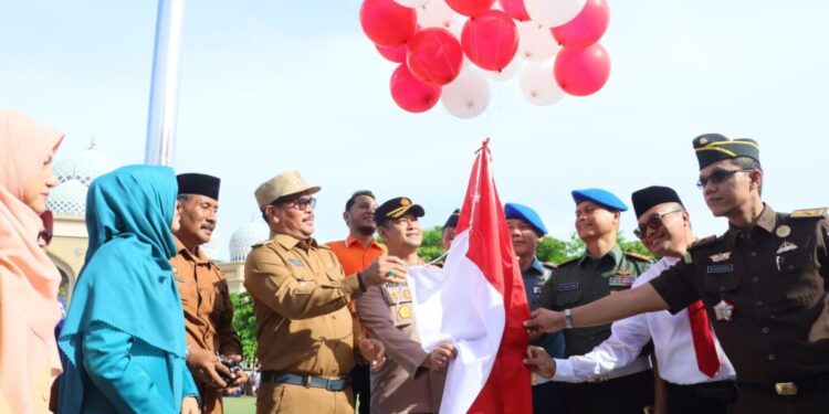 Tampak Lebih dari 1.000 peserta, termasuk Pj. Walikota, Kepala DPRK, dan sejumlah pejabat tinggi, turut serta dalam acara tersebut. Kegiatan dimulai dengan persiapan apel dan peluncuran pembagian 10 juta bendera Merah Putih.