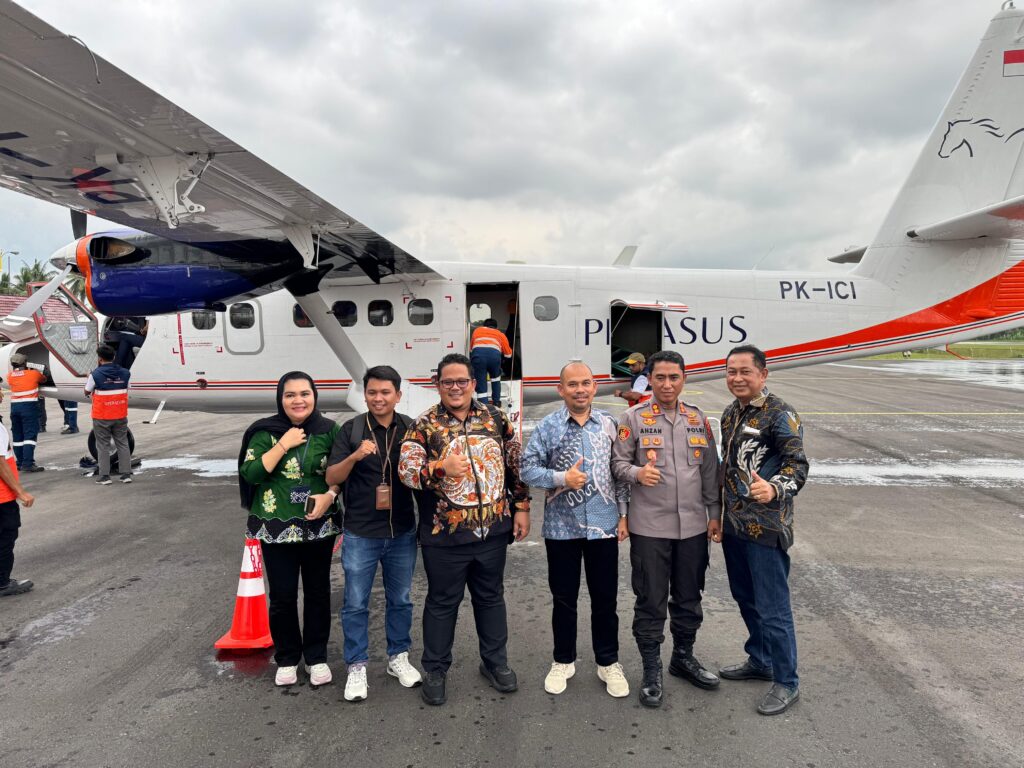 Acara diakhiri dengan penyambutan pesawat yang disemprot air mancur oleh tim pemadam bandara, menciptakan suasana penuh antusias dan harapan baru bagi kemajuan daerah.