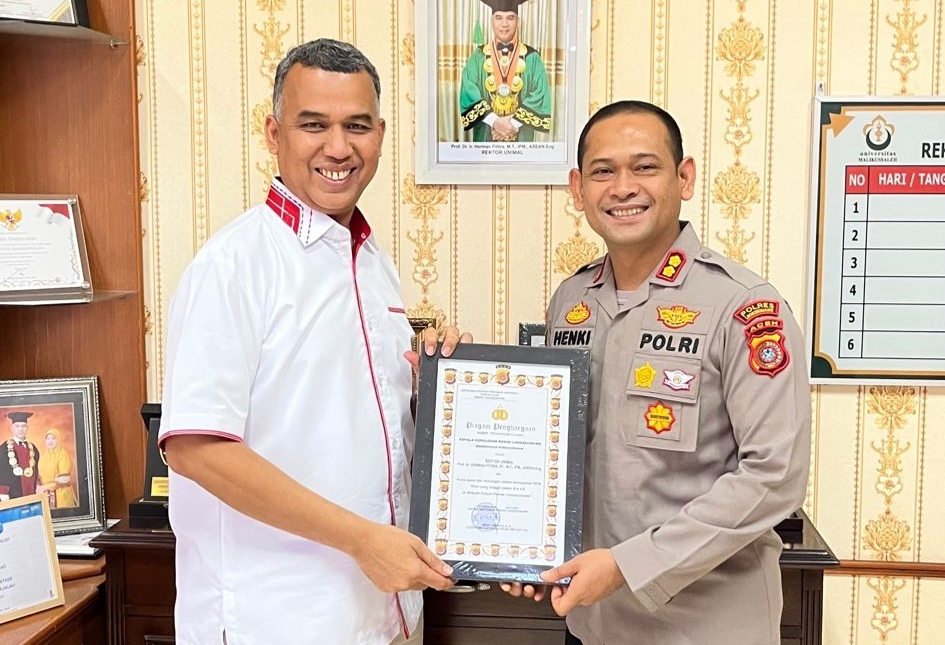 Dalam pertemuan silaturahmi itu, Kapolres Lhokseumawe, AKBP Henki Ismanto menyerahkan piagam penghargaan dan mengucapkan terima kasih kepada Rektor Unimal yang telah mendukung fungsi dan peran Polri dalam mewujudkan Kamtibmas yang kondusif di wilayah hukum Polres Lhokseumawe khususnya di lingkungan kampus.