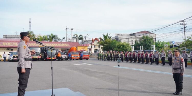 Lhokseumawe – Kapolres Lhokseumawe AKBP Dr. Ahzan, S.H., S.I.K., M.S.M., M.H memimpin apel kesiapsiagaan tanggap bencana di halaman Satya Haprabu Polres Lhokseumawe, Rabu pagi (5/11/2025).